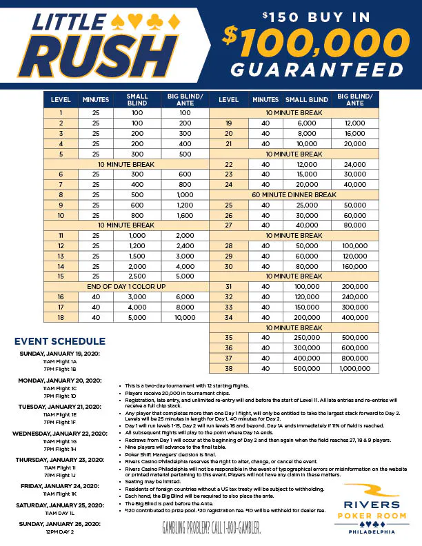 The $150 Little Rush has been redesigned for Rivers Poker Room Philadelphia. Players can compete in any of twelve Day 1 flights from January 19th – 25th for a chance to advance to January 26th’s Day 2. Starting stacks are 20,000 chips and Day 1 levels are 25 minutes in length. Day 2 levels are 40 minutes long and will play until we have a winner. The prize pool is guaranteed to be at least $100,000!