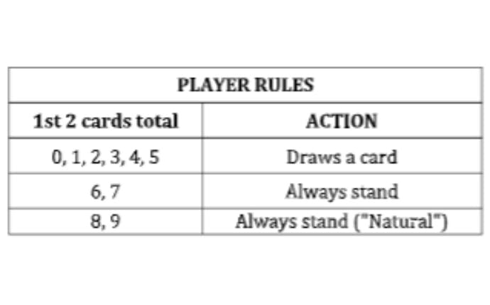 - Banker wins with 3 card total of 7/Player and tie lose and Banker push