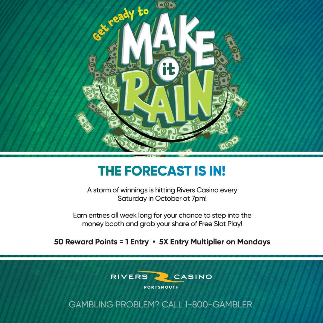 One Lucky Rush Rewards Member with qualifying entries will be called every 30 minutes to get into the Money Booth to catch as much Rivers Cash as they can for one minute. The amount collected will be rewarded in Free Slot Play! Rush Rewards Members can earn entries starting October 1. For every 50 Reward Points earned, that will be equal to one (1) entry into our Saturday night drawings starting at 7PM until 9PM.