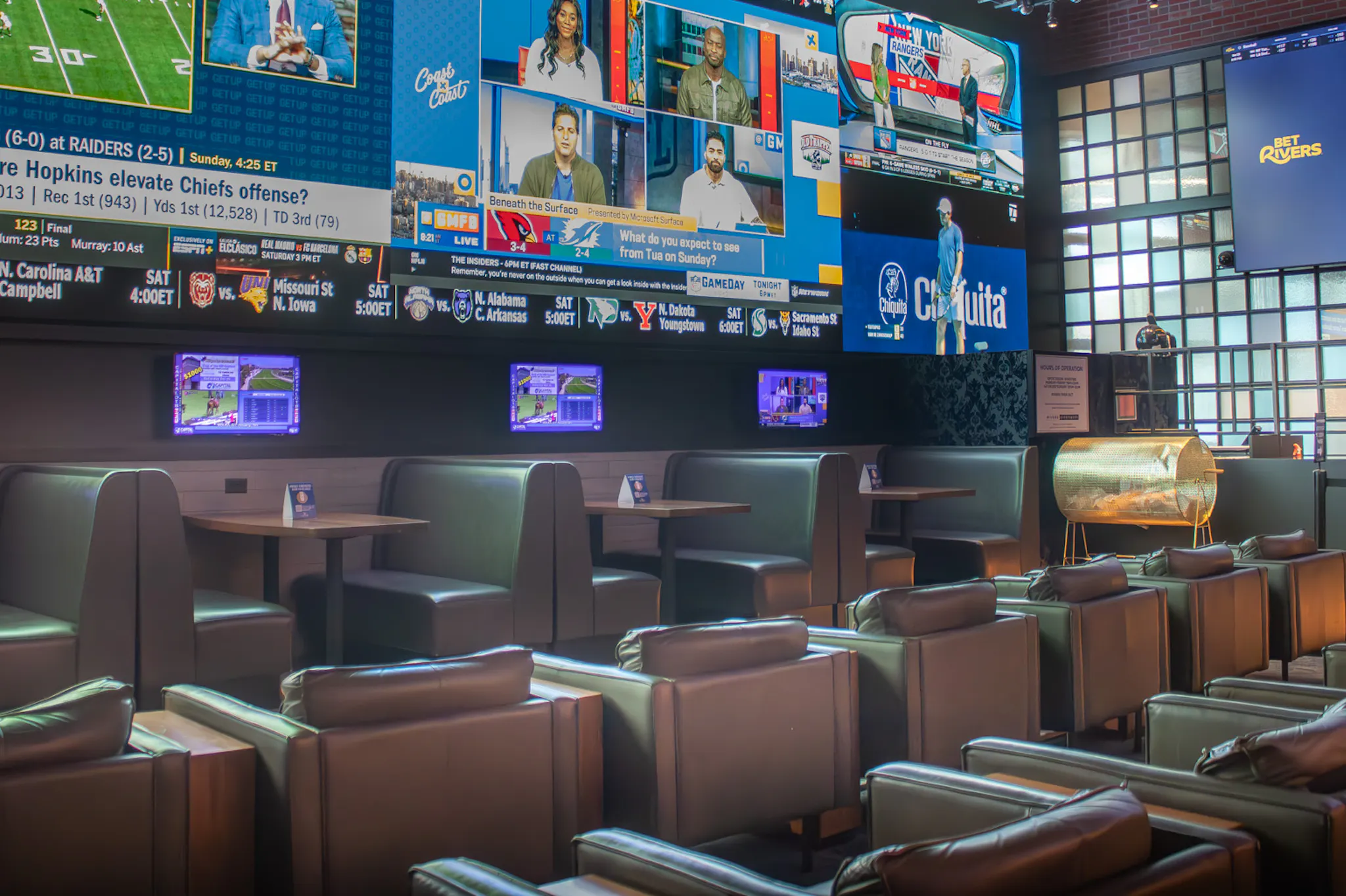 BetRivers Sportsbook is a luxury lounge featuring VIP seating and five private 6-person booths. It boasts a massive 53-foot LED video wall with 22 additional screens. Guests can place wagers through our kiosks located on the perimeter of BetRivers Sportsbook or at staffed betting windows during operating hours.