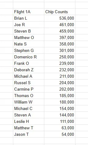 Day 1A is in the books! Flight 1 had 158 entries with 19 players moving on to Day 2 on Sunday. There are still 4 flights remaining this Monday through Thursday all starting at 4:15PM. We hope to see you there! Chip counts for Flight 1A are below.
