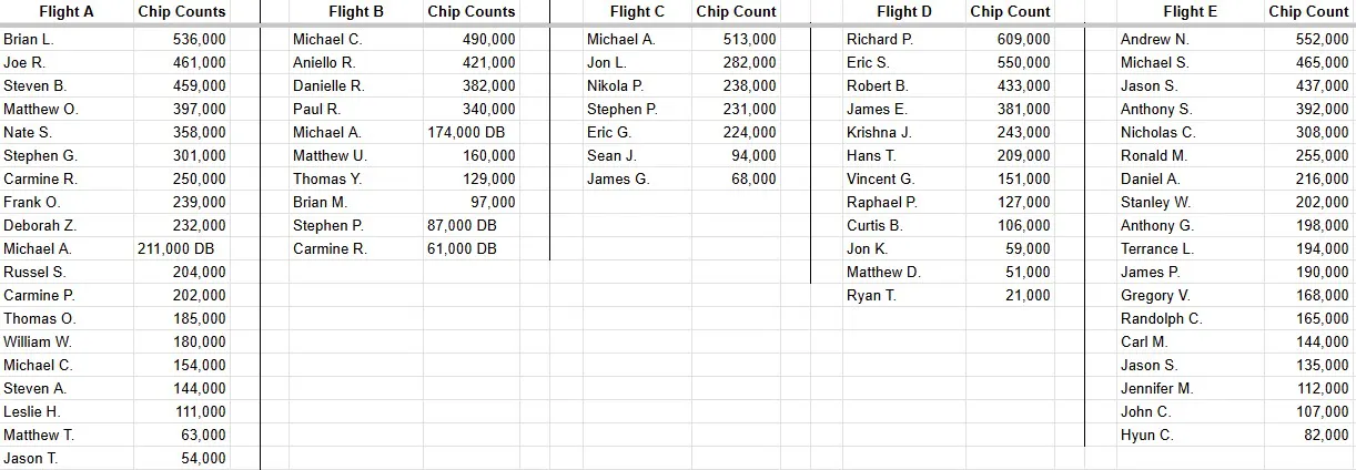 Day 1s of the Electric City Mini Series are over! 62 players are returning to Day 2 starting at 12:15PM on Sunday. Seat assignments will be available soon, but for now here are the chip counts for returning players!