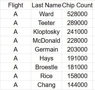 Flight 1A had 74 total players with 9 moving on to Day 2 on Sunday. Flight 1B is currently in progress, with 3 more flights on Tuesday, Wednesday, and Thursday at 4:15PM. One in Eight players survive to make the Day 2 on Sunday! Here are chip counts from Day 1A.